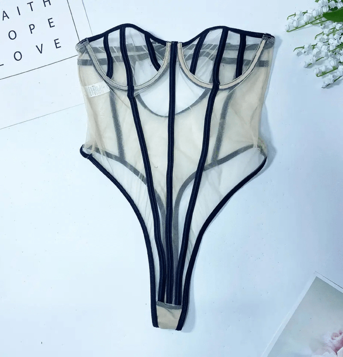 Este bodysuit importado está confeccionado en un suave microtul color nude, cuenta con detalles de tiras negras que realzan su diseño y aportan un toque de sofisticación.