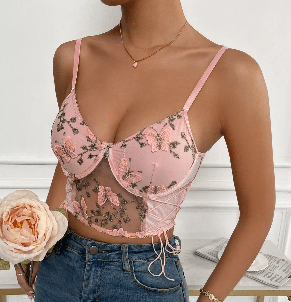 Este modelo cuenta con microtul en color rosa y mariposas bordadas en el mismo tono, adornadas con detalles dorados que le dan un toque especial.